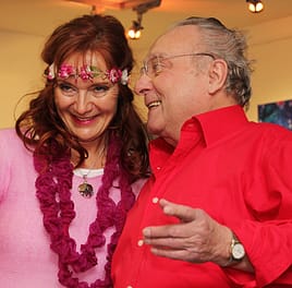Beate Böer, auf unseren Bildern mit Adolf Guba und bei ihrer Präsentation der Ausstellung, arbeitete mit Acryl, kristallinen Farben und Aura Soma Essenzen auf Leinwand. Ihre Philosphie: Heute gibt es einen guten Grund zu feiern, denn wir leben immer nur im Hier und Jetzt.